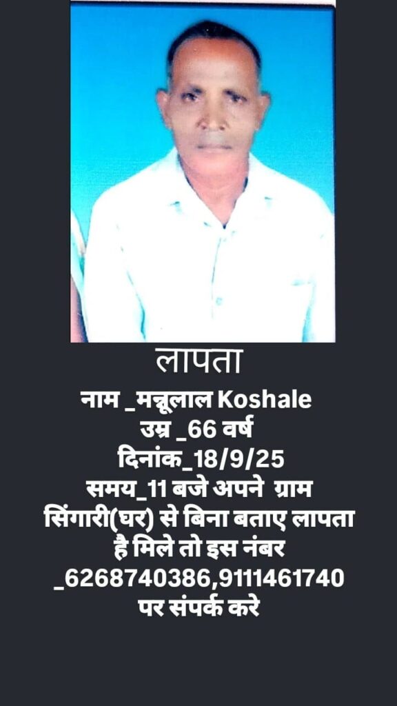 थाना रतनपुर क्षेत्र अंतर्गत ग्राम सिंहपरी निवासी मन्नू लाल सूर्यवंशी पिता जैतराम सूर्यवंशी उम्र 68 वर्ष बीते दिनों अचानक लापता हो गए हैं।