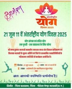 अंतरराष्ट्रीय योग दिवस पर पेंड्रा में होगा जिला स्तरीय सामूहिक योग कार्यक्रम, विधायक प्रणव मरपच्ची होंगे मुख्य अतिथि