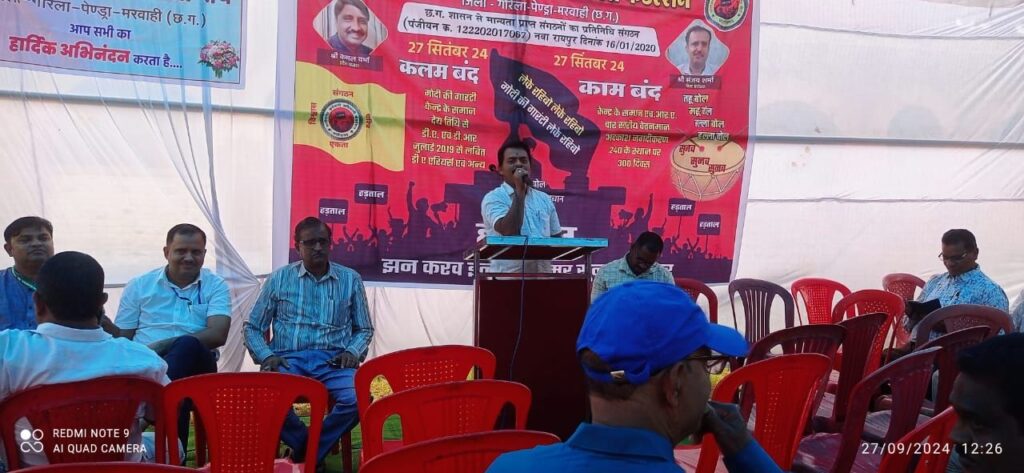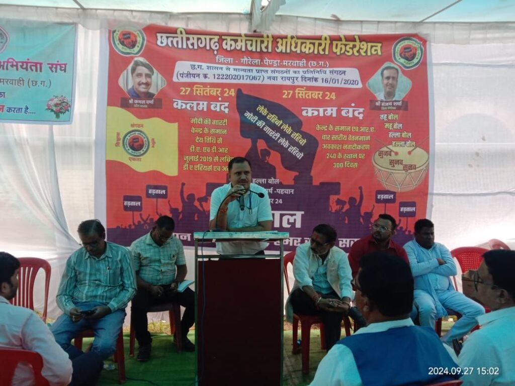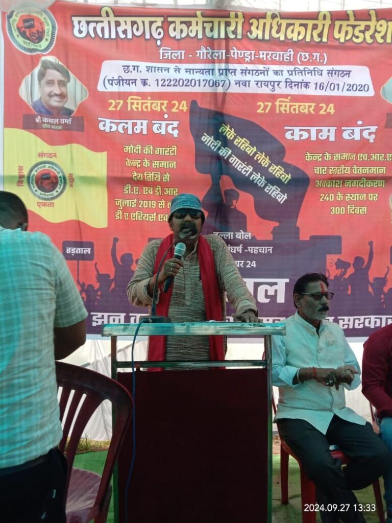 27 सितंबर को गौरेला पेंड्रा मरवाही जिले के सरकारी अधिकारी एवं कर्मचारियों ने जिले का सरकारी कामकाज प्रभावित कर दिया तथा अपनी चट्टानी एकता प्रदर्शित करते हुए छत्तीसगढ़ सरकार को चेतावनी दी है कि यदि आज की हड़ताल के बावजूद यदि सरकार कर्मचारियों की चार सूत्रीय मांग पूरी नहीं करती तो आने वाले समय में छत्तीसगढ़ कर्मचारी अधिकारी फेडरेशन अनिश्चितकालीन हड़ताल का आयोजन करेगा। जिला मुख्यालय गौरेला पेंड्रा मरवाही स्थित धरना प्रदर्शन स्थल लाल बंगला में आयोजित एक बड़ी जनसभा को जिले के अधिकारी कर्मचारियों ने संबोधित करते हुए कहा कि छत्तीसगढ़ सरकार मोदी की गारंटी के तहत कर्मचारियों अधिकारियों से चुनाव के समय किए गए वादों को 9 महीने बाद भी पूरी नहीं कर पाई है जिससे छत्तीसगढ़ के अधिकारी कर्मचारियों में रोष है। खासकर महंगाई भत्ते को छत्तीसगढ़ सरकार लगातार रोक कर कर्मचारियों को प्रताड़ित कर रही है। एक परंपरा सी बन गई है कि कर्मचारियों को छत्तीसगढ़ में देर से महंगाई भत्ता दिया जाता है तथा उसका एरिया का भुगतान भी नहीं किया जा रहा है।