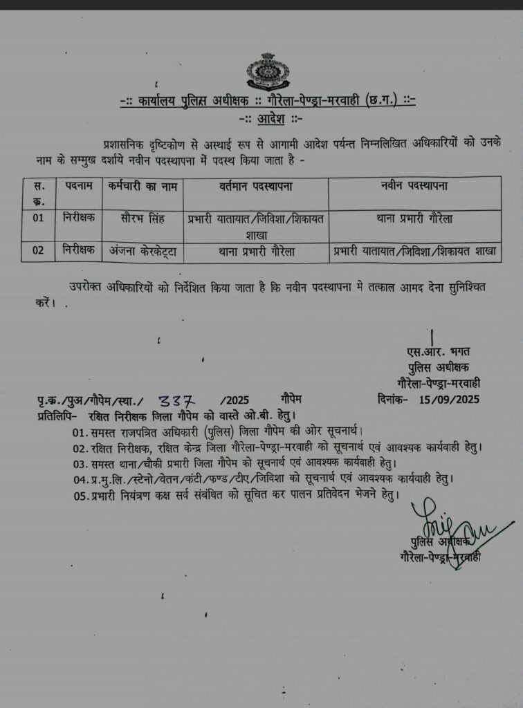 जारी आदेश के अनुसार, अंजना केरकेट्टा को प्रभारी यातायात/जिविशा/शिकायत शाखा की जिम्मेदारी सौंपी गई है, जबकि सौरभ सिंह को गौरेला थाने का प्रभार दिया गया है। हालांकि इस स्थानांतरण आदेश को प्रशासनिक दृष्टिकोण से किया गया है।