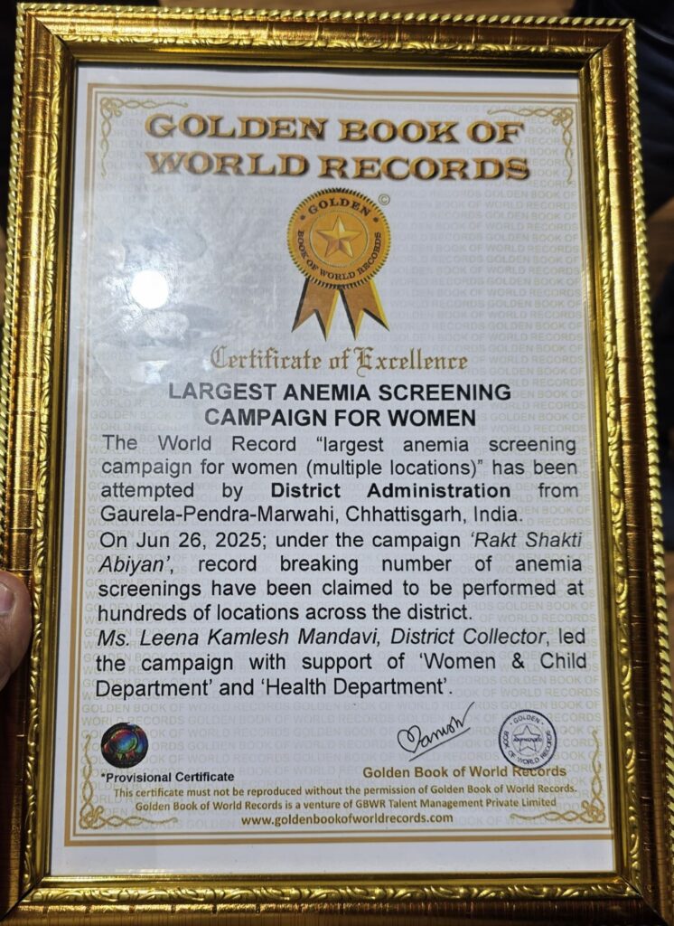 छत्तीसगढ़ के नवगठित आदिवासी बहुल जिले गौरेला-पेंड्रा-मरवाही ने महिला स्वास्थ्य और सशक्तिकरण के क्षेत्र में एक ऐतिहासिक कीर्तिमान स्थापित करते हुए गोल्डन बुक ऑफ वर्ल्ड रिकॉर्ड में अपना नाम दर्ज कराया है। जिले में 26 जून को चलाए गए रक्त शक्ति महाअभियान के अंतर्गत एक ही दिन में 51,727 महिलाओं का हीमोग्लोबिन (Hb) परीक्षण कर यह रिकॉर्ड बनाया गया।