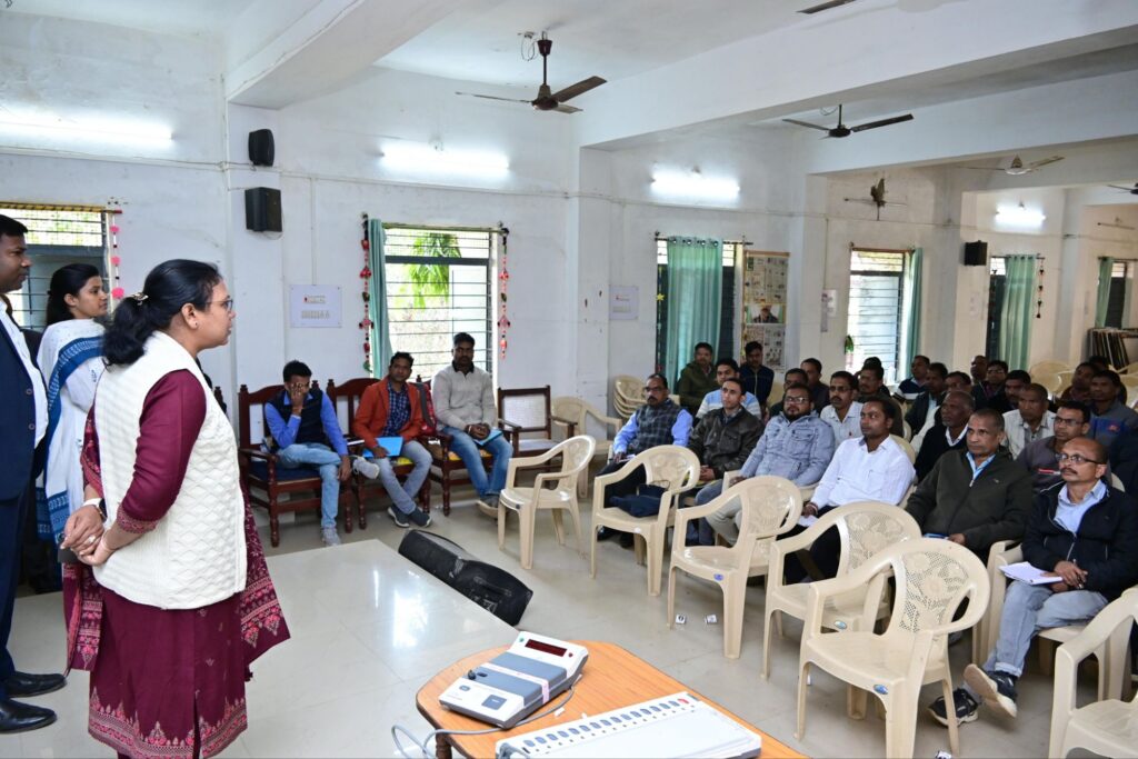 नगरीय निकायों और त्रिस्तरीय पंचायत आम निर्वाचन के लिए मतदान कर्मियों को दिए जा रहे प्रशिक्षण गतिविधियों का कलेक्टर श्रीमती लीना कमलेश मंडावी ने जायजा लिया। उन्होंने प्रशिक्षण प्राप्त कर रहे मतदान दलों को प्रशिक्षण की बारीकियों को गंभीरता से समझने और किसी भी तरह की समस्या एवं शंका होने पर मास्टर ट्रेनर्स से समाधान प्राप्त करने कहा। कलेक्टर ने स्वामी आत्मानंद अंग्रेजी माध्यम विद्यालय सेमरा में त्रिस्तरीय पंचायत निर्वाचन के लिए और जिला शिक्षा एवं प्रशिक्षण संस्थान पेण्ड्रा में नगरीय निकाय निर्वाचन के लिए मतदान कर्मियों को प्रथम चरण में दिए जा रहे प्रशिक्षण का अवलोकन किया। उन्होंने प्रत्येक कक्षों में जाकर प्रशिक्षण प्राप्त कर रहे मतदान दलों से रूबरू हुई और मास्टर ट्रेनर्स द्वारा नगरीय निकायों का चुनाव ईव्हीएम के माध्यम से तथा त्रिस्तरीय पंचायतों का चुनाव बैलेट पेपर से मतपेटी के माध्यम से कराए जाने के लिए दिए जा रहे प्रशिक्षण की जानकारी ली।