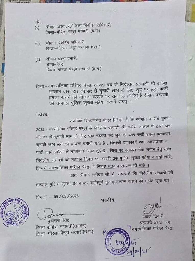 (गौरेला-पेंड्रा-मरवाही), 9 फरवरी – नगर निकाय चुनाव 2025 में एक अनोखा मामला सामने आया है, जहां आमतौर पर प्रत्याशी खुद की सुरक्षा की मांग करते हैं, वहीं पेंड्रा नगर पालिका के कांग्रेस प्रत्याशी पंकज तिवारी ने अपने प्रतिद्वंद्वी निर्दलीय प्रत्याशी की सुरक्षा की मांग कर राजनीतिक हलचल बढ़ा दी है।