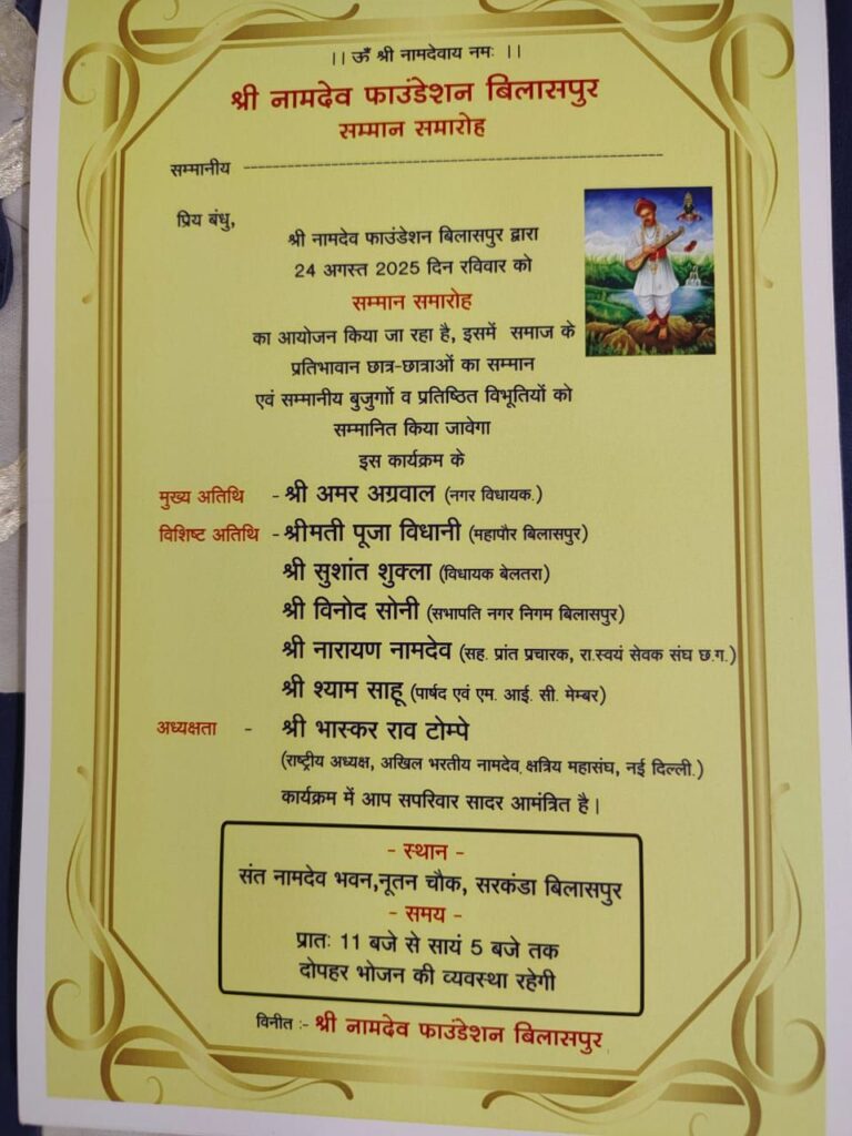 श्री नामदेव फाउंडेशन बिलासपुर का संत नामदेव भवन में बड़ा आयोजन , विधायक अमर अग्रवाल ,सुशांत शुक्ला, महापौर पूजा विधानी, फेडरेशन के राष्ट्रीय अध्यक्ष भास्कर राव करेंगे प्रतिभाओं का सम्मान