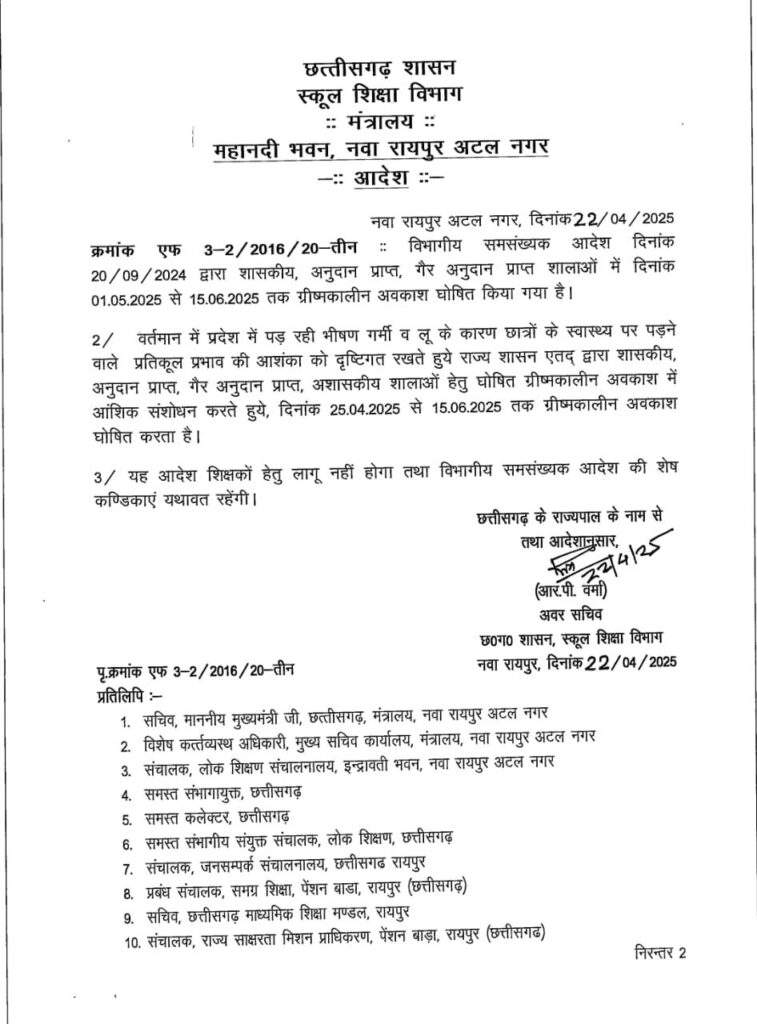 प्रदेश में पड़ रही भीषण गर्मी और लू के मद्देनज़र छात्रों के स्वास्थ्य पर प्रतिकूल प्रभाव की आशंका को ध्यान में रखते हुए छत्तीसगढ़ शासन के स्कूल शिक्षा विभाग ने समस्त शासकीय, अशासकीय, अनुदान प्राप्त एवं गैर-अनुदान प्राप्त स्कूलों के लिए 25 अप्रैल 2025 से 15 जून 2025 तक ग्रीष्मकालीन अवकाश घोषित कर दिया है।