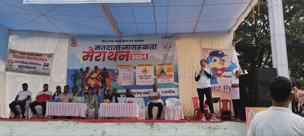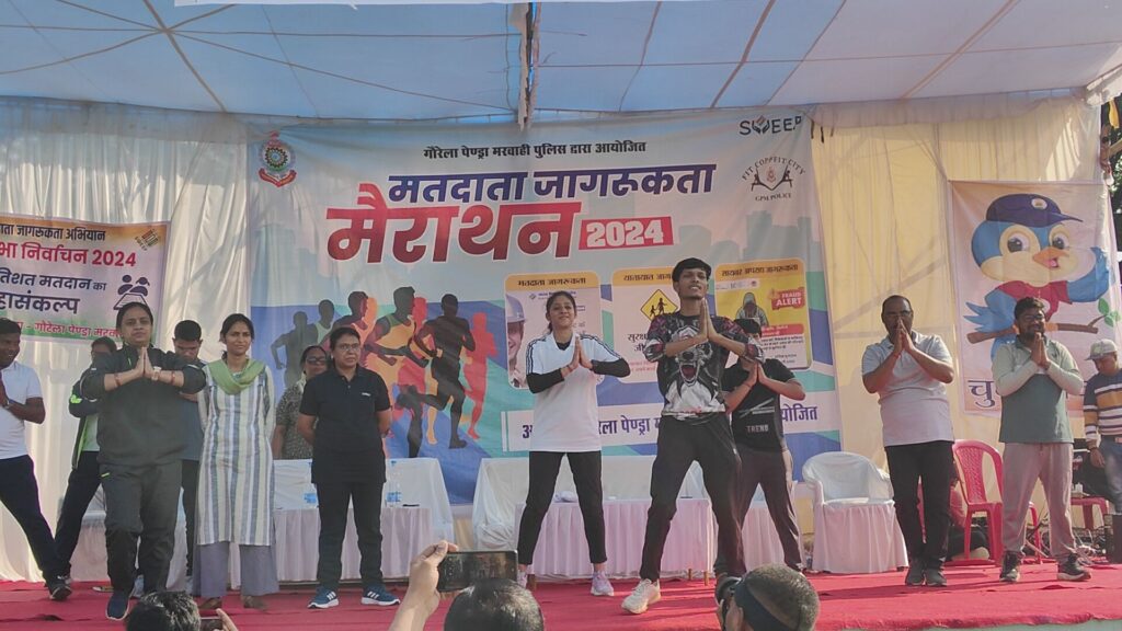 लोकसभा चुनाव 2024 के लिए होने वाले मतदान को लेकर जिला प्रशासन एवं पुलिस प्रशासन गौरेला पेंड्रा मरवाही द्वारा आयोजित मतदाता जागरूकता मैराथन में जिले के 560 प्रतिभागी शामिल हुए जिसमें युवा, खिलाड़ी, छात्र, नागरिक एवं अधिकारी कर्मचारी शामिल हुए। मतदाता जागरूकता मैराथन की खूबसूरती यह रही कि जिले की दोनों प्रमुख महिला अधिकारी कलेक्टर लीना कमलेश मंडावी एवं पुलिस अधीक्षक भावना गुप्ता ने मंच पर खिलाड़ियों के साथ संयुक्त रूप से जुंबा डांस में भाग लेकर प्रतिभागियों का उत्साहवर्धन किया वही वही जिले की पुलिस अधीक्षक श्रीमती भावना गुप्ता ने महिला वर्ग में प्रथम स्थान प्राप्त किया।इस अवसर पर जिला प्रशासन एवं पुलिस प्रशासन ने संयुक्त रूप से कार्यक्रम आयोजित कर मतदाताओं को 7 मई को अधिक से अधिक मतदान में भाग लेने का आह्वान किया।