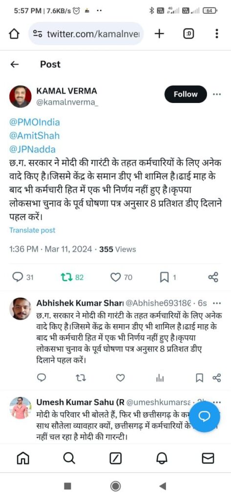भूपेश सरकार के खिलाफ छत्तीसगढ़ के अधिकारी कर्मचारियों का असंतोष का सीधा लाभ भाजपा को मिला और अब छत्तीसगढ़ में विष्णु देव सायके नेतृत्व में भाजपा की सरकार है परंतु परिस्थितियों चाहे जो भी हो पता नहीं क्यों छत्तीसगढ़ की भाजपा सरकार छत्तीसगढ़ के अधिकारी कर्मचारियों को केंद्र के समान महंगाई भत्ता नहीं दे रही है जबकि उत्तर प्रदेश सहित देश के अन्य राज्य केंद्रीय कर्मचारियों के महंगाई भत्ता के बढ़ने के बाद अपने-अपने राज्य के कर्मचारियों को केंद्र के समान महंगाई भत्ता दे रहे हैं। इधर पहले ही केंद्र से चार प्रतिशत पीछे चल रहे छत्तीसगढ़ के अधिकारी कर्मचारी का धैर्य अब टूटता जा रहा है क्योंकि उन्हें ऐसा लग रहा है कि पता नहीं कब आचार संहिता लग जाए तथा उन्हें केंद्र के समान महंगाई भत्ता से वंचित होना पड़े। इधर बीते दिनों केंद्रीय सरकार ने अपने कर्मचारियों के लिए चार प्रतिशत अतिरिक्त महंगाई भत्ता की फिर घोषणा कर दी है जिसके बाद भी छत्तीसगढ़ में अधिकारी कर्मचारियों का महंगाई भत्ता स्वीकृत नहीं हुआ है ऐसे में कर्मचारियों अधिकारियों तथा पेंशनरों के बीच तरह-तरह की चर्चाएं चल रही है।