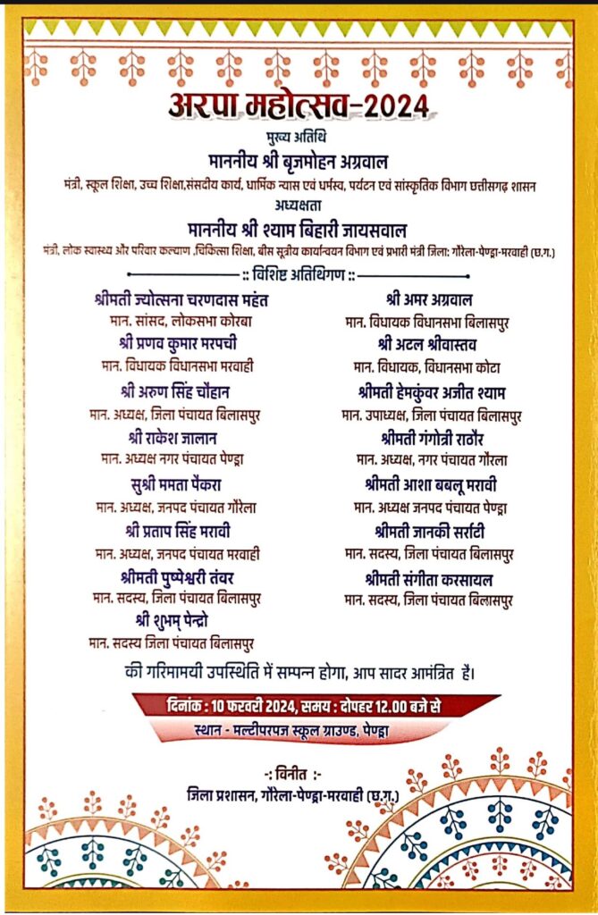 महोत्सव की अध्यक्षता लोक स्वास्थ्य और परिवार कल्याण, चिकित्सा शिक्षा, बीस सूत्री कार्यान्वयन और जिले के प्रभारी मंत्री श्याम बिहारी जायसवाल करेंगे। समारोह में विशिष्ट अतिथि के रूप में सांसद कोरबा ज्योत्सना चरणदास महंत, विधायक मरवाही प्रणव कुमार मरपची, विधायक बिलासपुर अमर अग्रवाल, विधायक कोटा अटल श्रीवास्तव, जिला पंचायत बिलासपुर के अध्यक्ष अरुण सिंह चौहान एवं उपाध्यक्ष श्र हेमकुंवर अजीत श्याम, अध्यक्ष नगर पंचायत पेण्ड्रा राकेश जालान, अध्यक्ष नगर पंचायत गौरला गंगोत्री राठौर, अध्यक्ष जनपद पंचायत पेण्ड्रा आशा बबलू मरावी, अध्यक्ष जनपद पंचायत गौरेला ममता पैकरा, अध्यक्ष जनपद पंचायत मरवाही प्रताप सिंह मरावी और सदस्य जिला पंचायत बिलासपुर पुष्पेश्वरी तंवर, जानकी सर्राटी, संगीता करसायल एवं शुभम् पेन्द्रो शामिल होेंगे। जिला प्रशासन द्वारा 10 फरवरी को मल्टीपर्पस स्कूल मैदान पेण्ड्रा में आयोजित समारोह का शुभारंभ दोपहर 12 बजे से होगा। अरपा महोत्सव में शाम 5 बजे छात्र-छात्राओं द्वारा नृत्य एवं संगीत, जीपीएम टूरिज्म गीत एवं भरतनाट्य और रात्रि 8 बजे श्री नासिर एवं श्री निन्दर द्वारा सुफियाना संगीत की प्रस्तुति दी जाएगी।
