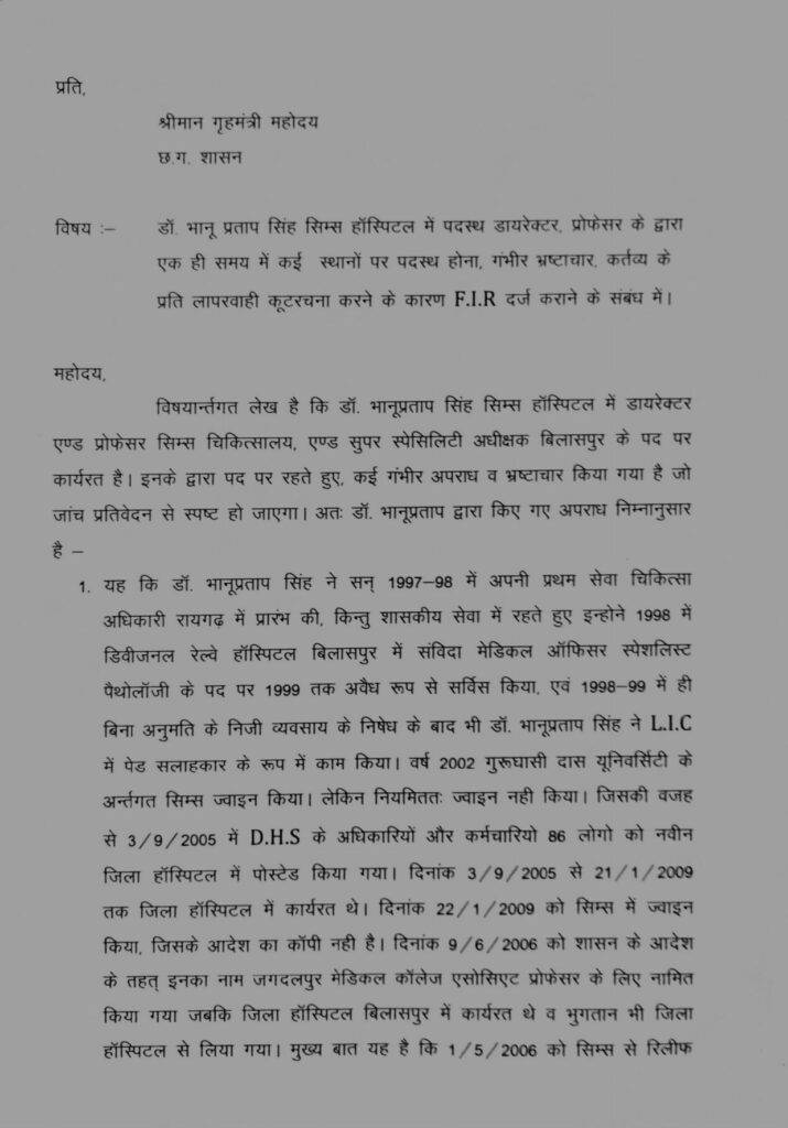 अघोषित संपत्ति, अवैध रूप से संपत्ति क्रय, तथा आय से अधिक संपत्ति, हड़ताल/धरना प्रदर्शन में संलिप्तता और अधिकारियों की आज्ञा उल्लंघन, जैसी शिकायत की मुख्यमंत्री, गृह मंत्री छत्तीसगढ़ शासन को कि गई थी जिसपर सिम्स के ही तीन वरिष्ठ डॉक्टरों की जांच समिति (डॉ. कमल किशोर सहारे, डॉ. आरती पांडेय, डॉ. रविकांत दास) ने रिपोर्ट में स्पष्ट रूप से डॉ. बी.पी. सिंह को दोषी पाया है और कहा है कि “उनका आचरण बर्खास्तगी योग्य है, उन्होंने गंभीर आर्थिक व नैतिक गड़बड़ियों को अंजाम दिया है।”