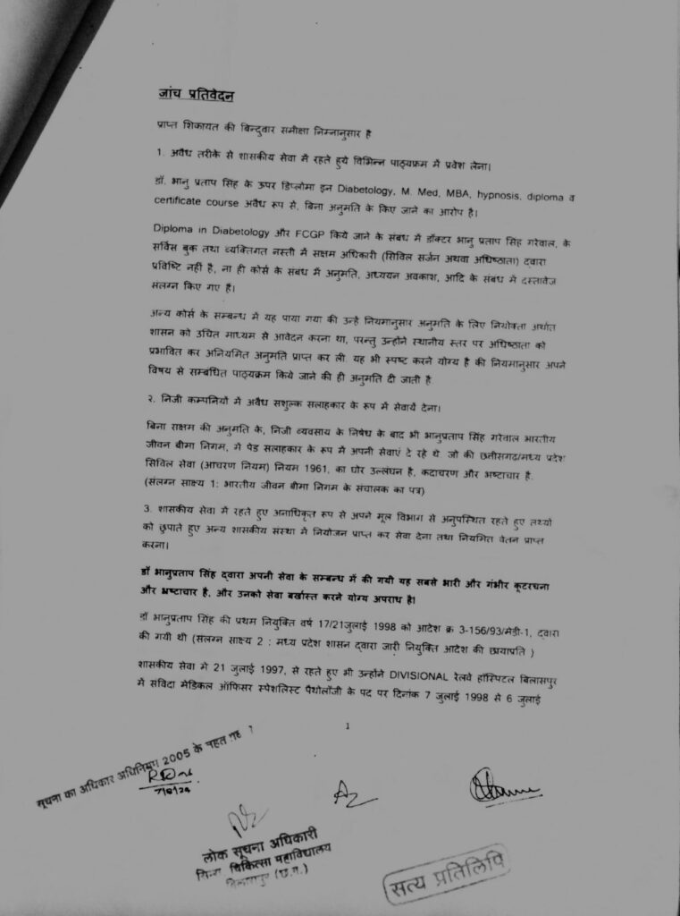 रेलवे अस्पताल में समानांतर नौकरी व वेतन लेना, मेडिकल ऑक्सीजन खरीदी में टेंडर शर्तों का उल्लंघन व वित्तीय गड़बड़ी, शासकीय वाहन का निजी उपयोग और साथ ही कन्वेन्स अलाउंस लेना, निजी लैब संचालन, जबकि सिम्स में निजी प्रैक्टिस प्रतिबंधित है